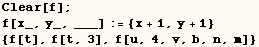 A more common use of an unamed BlankNullSequence is in the next cell. In this case (f) is defined when it gets two or more arguments. The first argument goes with (x_), the second argument goes with (y_), and all other arguments go with (___).